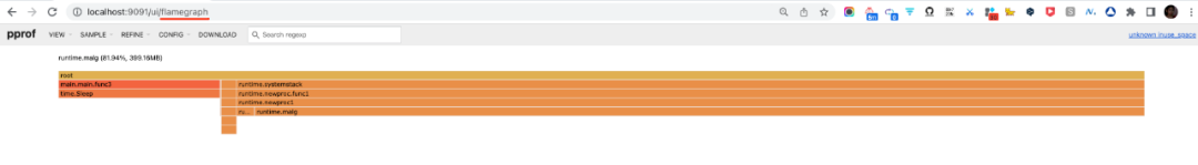 然而,新视图将显示一个火焰图视图,从下往上展示通往malloc的调用堆栈: