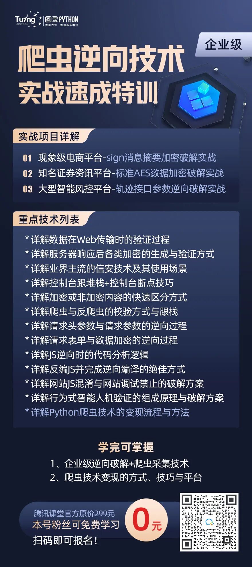 这是一套专讲爬虫逆向破解的高阶技术实战课,迄今为止已帮助近三万学员快速进阶。本次课程将由国际大数据竞赛获奖大佬亲身指导,带领大家进行高阶技术体系+逆向解析项目实战+技术变现路径指导的综合速成训练!