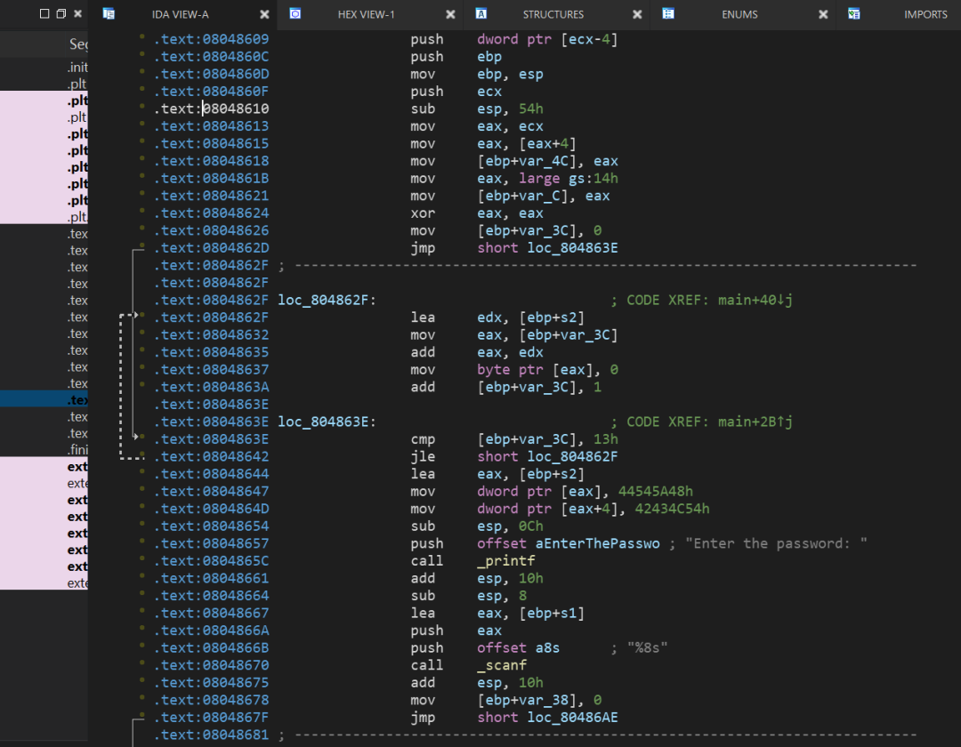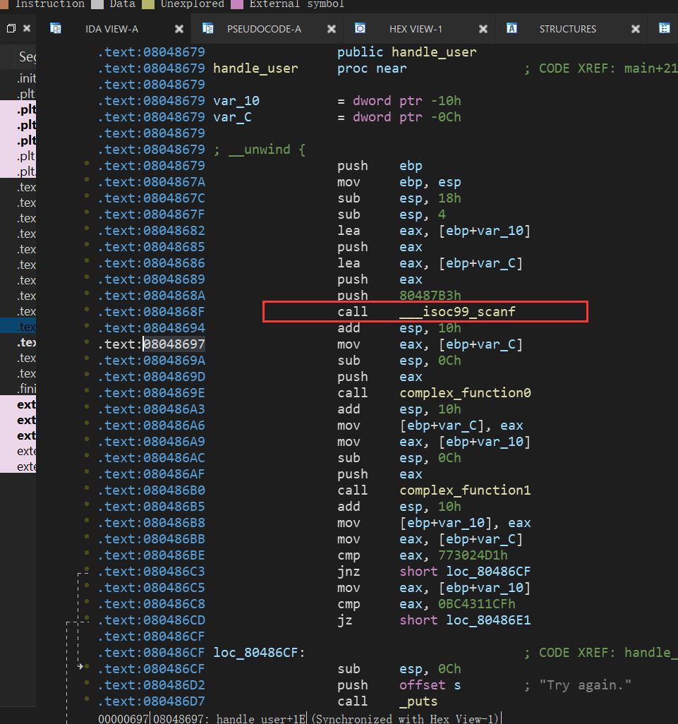 从这里可以看出,读入的三个值最终会分别存入eax和ebx和edx中,angr可以随意指定一个地址来往下进行运行,所以我们可以指定开始地址为:0x08048980