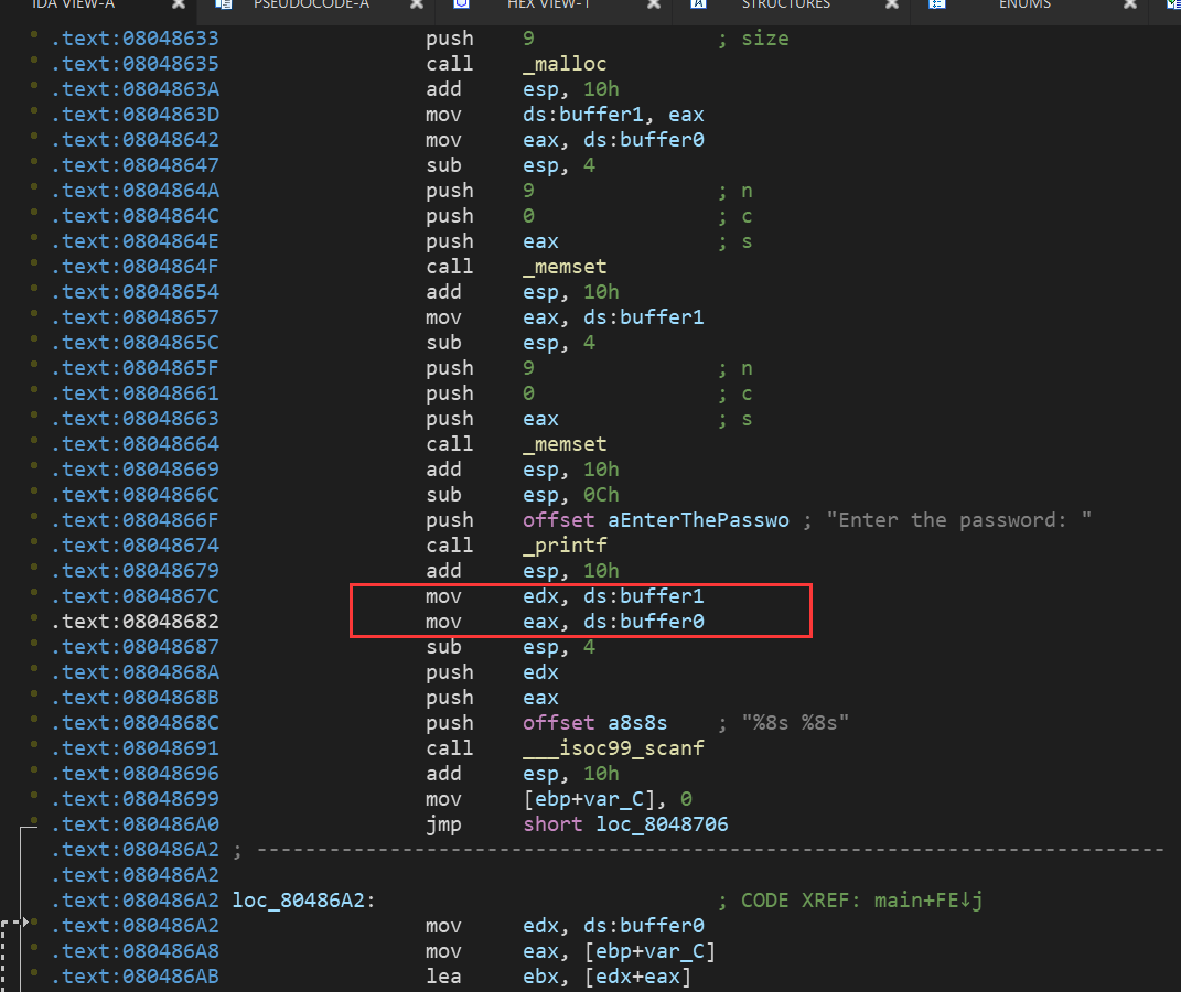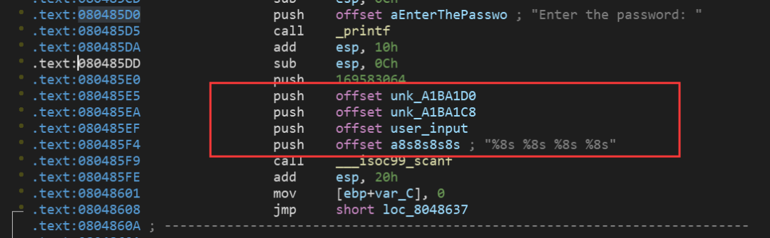 这里也是scanf读入数据,但是这次是储存在栈中,而不是寄存器