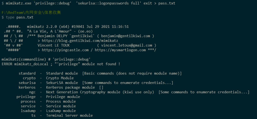 执行完后通过type命令查看等了好久都没有结果返回,猜测可能是是单双引号的问题,mimikatz抓取密码的原命令是: