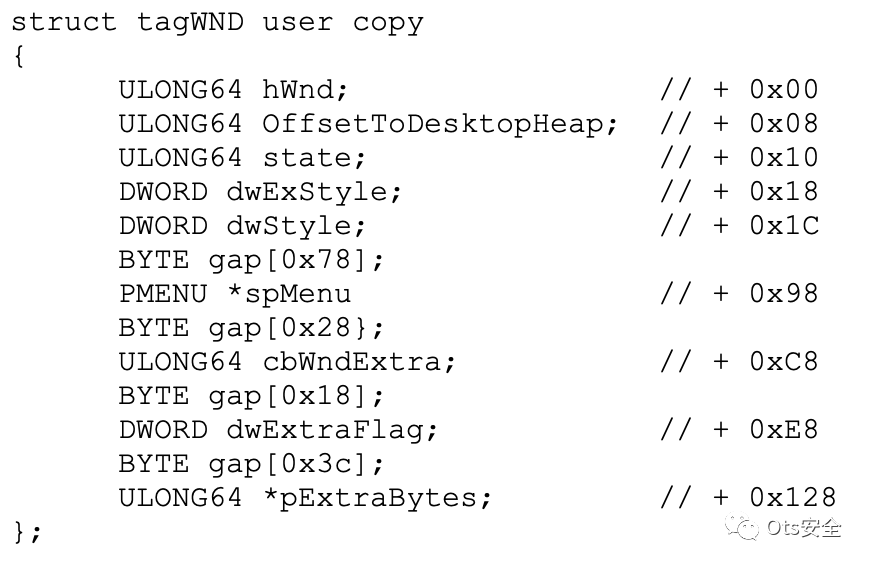 tagWND结构,如图 6 所示,过去在线程环境块 (TEB) 的 Win32ClientInfo 条目中被引用。它已被删除,以防止内核模式地址轻易泄漏。内核tagWND结构中的第一个条目是窗口句柄。每个窗口在内核中都会有一个与之关联的代表性tagWND结构。在 CVE-2022-21882 的分析过程中,这个结构很重要,但现在,我们将关注偏移量0x28。我将其标记为*pWND,因为 Microsoft 不再提供符号。此外,Microsoft 不再为该结构提供名称——但是,在过去它被称为状态或 WW。据微软称,这些名称已被弃用,不再在内部使用。了解此指针很重要的一点是,它是不包含内核地址的tagWND数据的用户模式版本,并且其结构与其父tagWND结构不同。这个子结构既存在于内核中也存在于用户模式中。这就是 Windows 管理数据以避免内核地址泄漏的方式,因为任何用户模式应用程序都将使用位于用户模式桌面堆上的tagWND结构的副本,因此将无法看到任何内核 -模式地址。我将继续将子结构称为tagWND结构。请注意,它的结构与上面的父tagWND结构不同(如下图 8 所示),但在其他研究博客和论文中仍通常称为tagWND。子tagWND结构如图8所示,通过逆向工程确定了元素及其偏移量。未对差距进行分析,对本次讨论并不重要。在有关创建窗口的部分中讨论的WNDCLASSEX结构的许多元素都可以在tagWND结构中看到。因此,很明显,在创建窗口时,通过WNDCLASSEX结构分配的属性将传递给内核并存储在tagWND结构中。然后将属性传播到内核和用户模式桌面堆中的用户副本。![]()