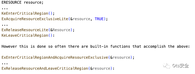 图 13. NtCallbackReturn函数原型。在 Win32k 管理结构上运行时,窗口管理器使用执行资源 ( ERESOURCE ) 同步原语,而不是独占锁。ERESOURCE原语允许多个线程在每个线程仅尝试读取相关资源的情况下访问共享资源。ERESOURCE原语也称为单写多读原语。ERESOURCE初始化后,线程可以使用ExAcquireResourceExclusiveLite获取独占锁(用于写入),或通过调用ExAcquireResourceSharedLite获取共享锁(用于读取)。然后线程通过调用释放资源ExReleaseResourceLite。需要禁用普通内核 APC 才能使用此处讨论的获取 API,这是通过在获取调用之前调用KeEnterCriticalRegion并在释放调用之后调用 KeLeaveCriticalRegion来完成的。如果 Win32k 在调用用户模式回调时没有释放资源,并且该用户模式回调允许应用程序冻结 GUI 子系统,则 Win32k 将无法在 GUI 子系统被冻结时执行其他任务。因此,Win32k 总是在调用用户模式回调时释放资源。下面图 14 中的代码演示了这是如何发生的。![]()