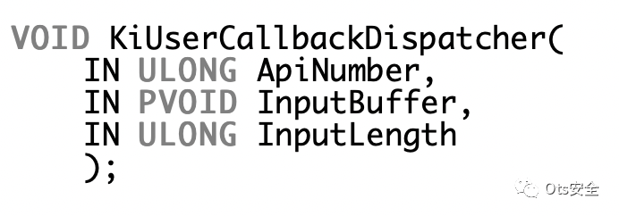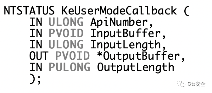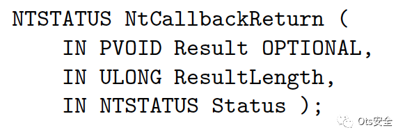 图 12. KiUserCallbackDispatcher函数原型。一旦用户模式回调完成,就会调用NtCallbackReturn以在内核中恢复执行。此函数将回调的结果复制回原始内核堆栈,并恢复保存在KERNEL_STACK_CONTROL结构中的陷阱帧(PreviousTrapFrame)和内核堆栈。在跳转到之前停止的位置(在ntdll!KiCallUserMode中)之前,内核回调堆栈被删除。![]()
