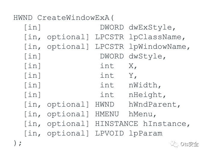 注册窗口后,我们可以通过调用CreateWindowExA()创建窗口类的实例,如下面的图 3 所示。