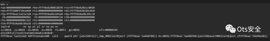 这不是完整的成员列表,只是那些对本次讨论很重要的成员。在调用xxxCreateWindowEx期间查看HMAllocObject,其中发生结构分配,我们可以确认此结构的大小为0x150 (336) 字节。调用HMAllocObject之前的 WinDbg 输出如图7 所示。您可以看到第四个参数(表示分配大小)存储在r9寄存器中并且等于0x150。![]()
