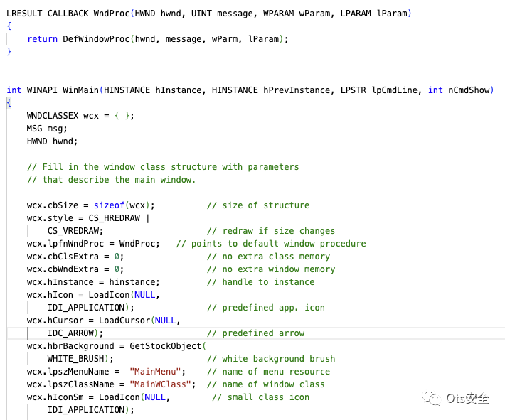 GetMessage ()函数从消息队列中检索下一条消息。MSG参数是一个结构,其中包含分配的窗口过程正确处理消息所需的消息信息。MSG结构的成员包括窗口句柄 ( hwnd ),窗口过程接收消息的窗口,以及包含标识符的消息,该标识符确定向窗口过程请求什么请求。例如,如果消息包含WM_PAINT消息,它会告诉窗口过程窗口的客户区已经改变,必须重新绘制。TranslateMessage ()函数将虚拟键消息转换为字符消息,但这对于当前的讨论并不重要。DispatchMessage ()将消息发送到由 msg 结构中的窗口句柄标识的窗口,由该窗口类定义的窗口过程处理。到目前为止,示例代码通过执行以下操作完成了定义窗口类的开销:注册窗口