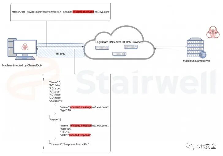 ChamelDoH 的独特之处在于其使用 DoH 的新颖通信方法,用于通过 HTTPS 协议执行域名系统 (DNS) 解析,向流氓域名服务器发送DNS TXT 请求。
