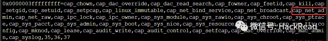CapEff 主要是检查线程的执行权限,所以重点看下利用 capsh --decode=0000003fffffffff 进行解码,检索默认没有添加的 NET_ADMIN,发现存在