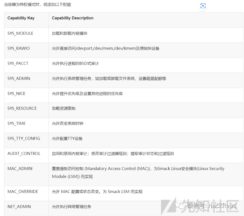 当容器为特权模式时,将添加如下功能:使用指南 - 特权容器