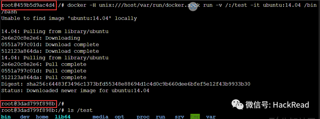 docker -H unix:///host/var/run/docker.sock run -v /:/test -it ubuntu:14.04 /bin/bash