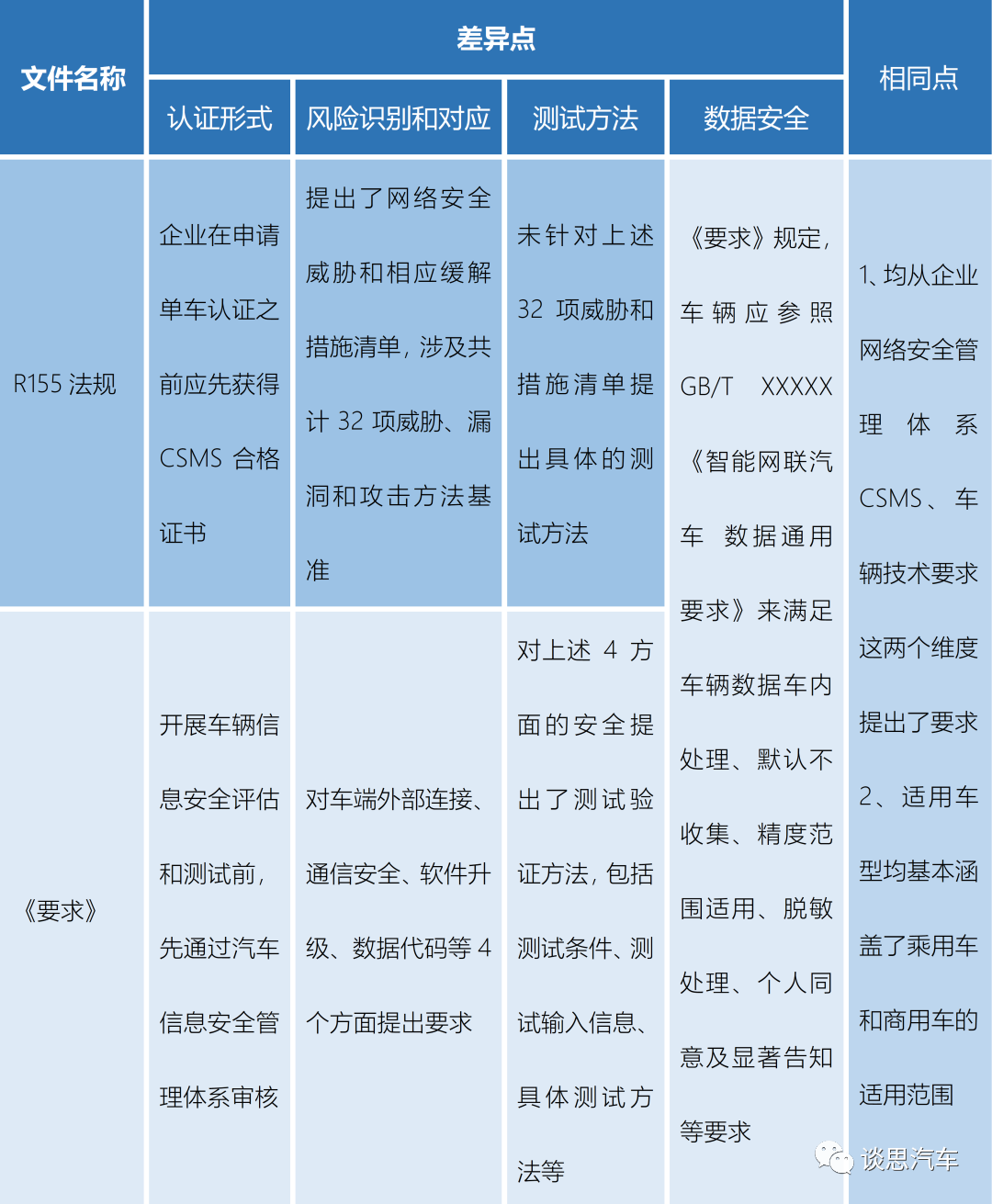本质上,《汽车整车信息安全技术要求》可以说是UN R155的汉化版,其制定过程参考了R155法规,但在认证形式、风险识别和对应、测试方法等方面,还是有明显差异的。