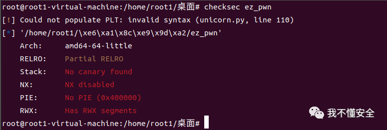 RWX: Has RWX segments 表示二进制文件中存在可读写可执行的内存段,是一个很容易受到攻击的弱点。