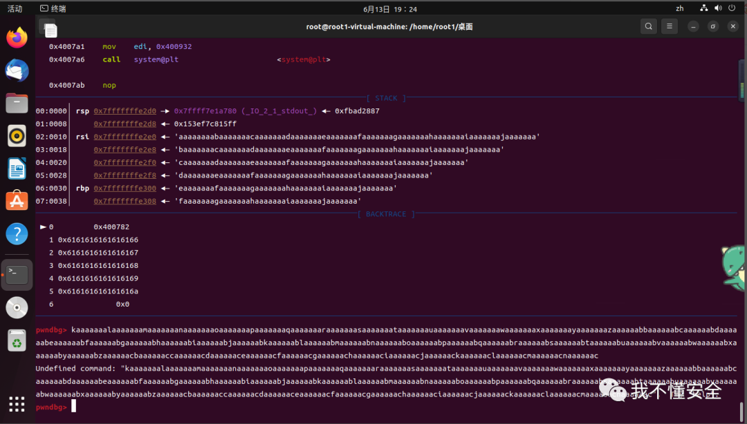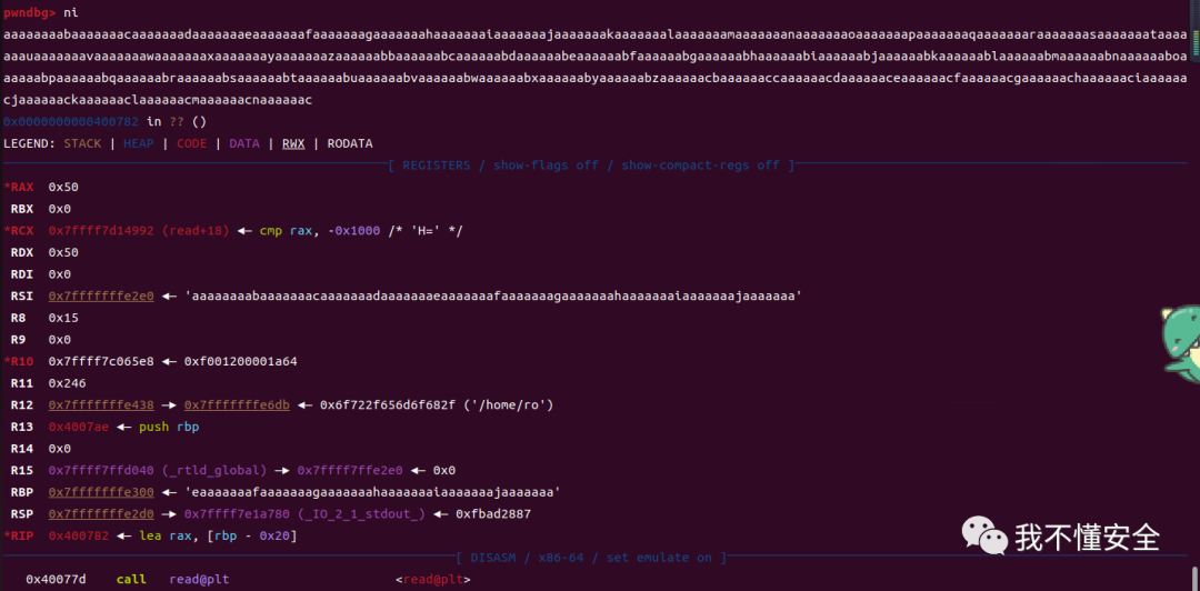 ni执行下一步,而后一直按回车,直到看到rsp寄存器为止(或者一直运行到程序不动)