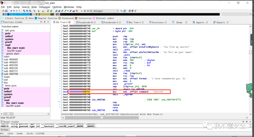 下一步就是直接找到system执行函数里面的 /bin/sh的寄存器地址 4007A1