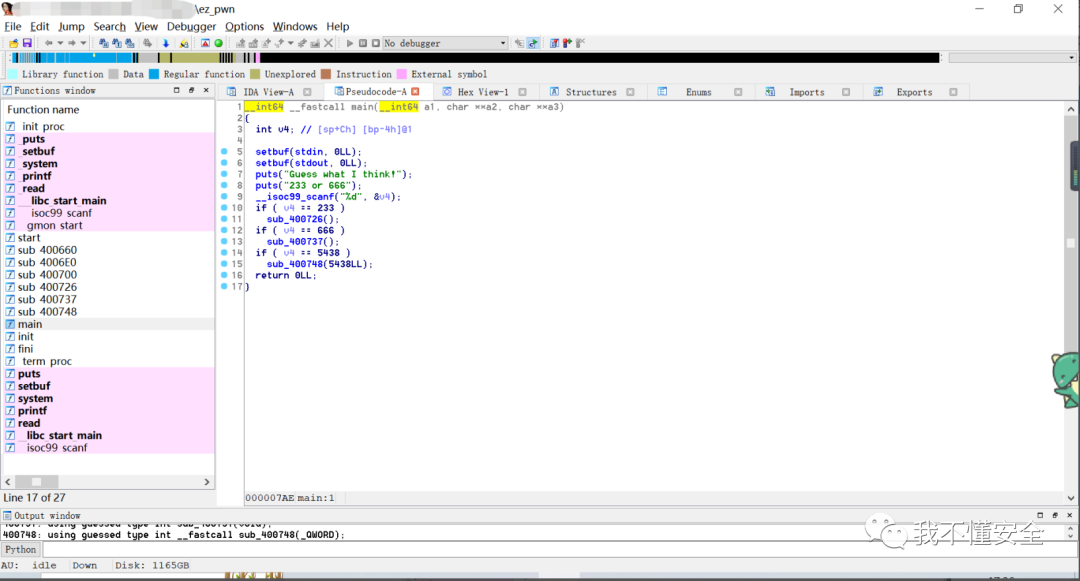 代码结构简单,程序运行首先会让你输入一个参数,233跳到sub_400726()函数,666跳到sub_400737()函数,5438跳到sub_400748(5438LL)函数