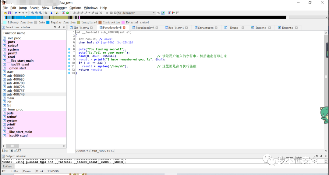 这个里面有一个system()函数,但是他是不能直接用的,因为他需要传递参数233的时候才能执行,但是传递只有传递的参数为5438的时候才能进入到sub_400748(int a1)这个函数里面,所以这里就需要利用堆栈溢出的漏洞来做