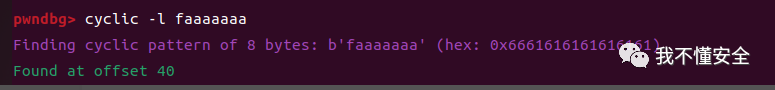 使用cyclic -l faaaaaaa 查看rsp寄存器偏移量,需要注意的是,cyclic -l 指定的是8个字节,所以需要将rsp寄存器的值取前8位