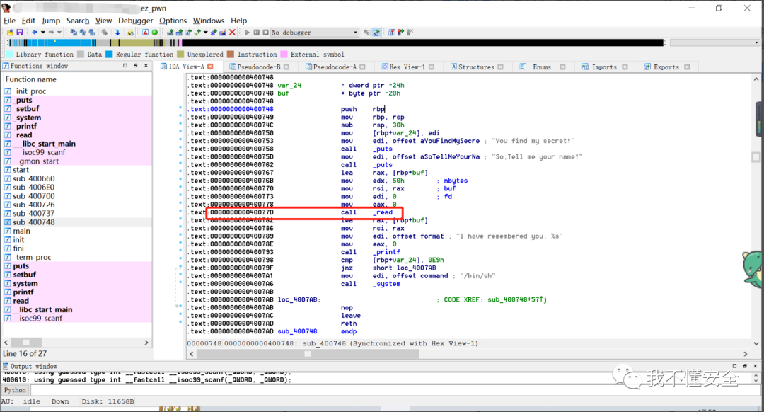 我们知道栈溢出是由于read()函数没有限制用户输入的字符长度引起的,所以我们在做动态调试的时候,需要知道read()函数的位置,好下断点 0x40077D