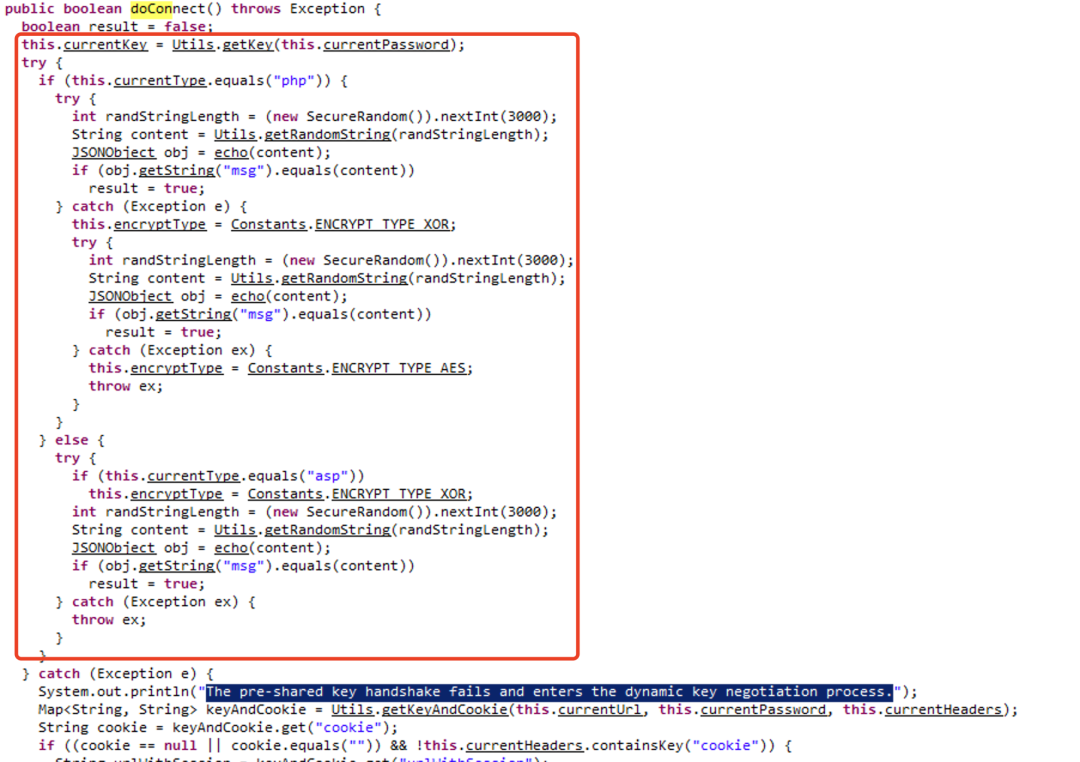 冰蝎3采用了预共享密钥确定密钥,逻辑代码为net/rebeyond/core/ShellService.java doConnect方法。