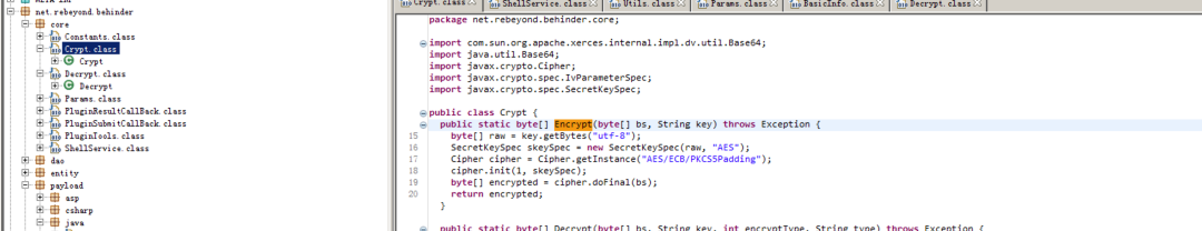 冰蝎使用AES加密传输payload,加密逻辑在net/rebeyond/core/Crypt.java。