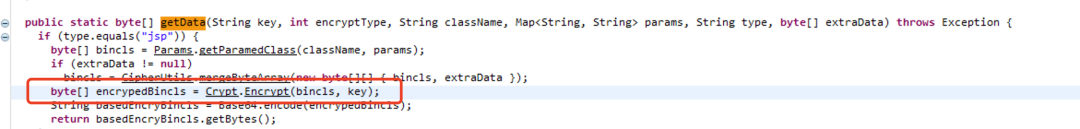 跟进去到Utils.getData(),当传入的type参数为jsp时进入Params.getParamedClass(),获取对应className的字节数组,将其加密和编码处理并返回。
