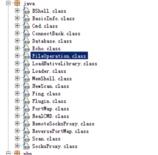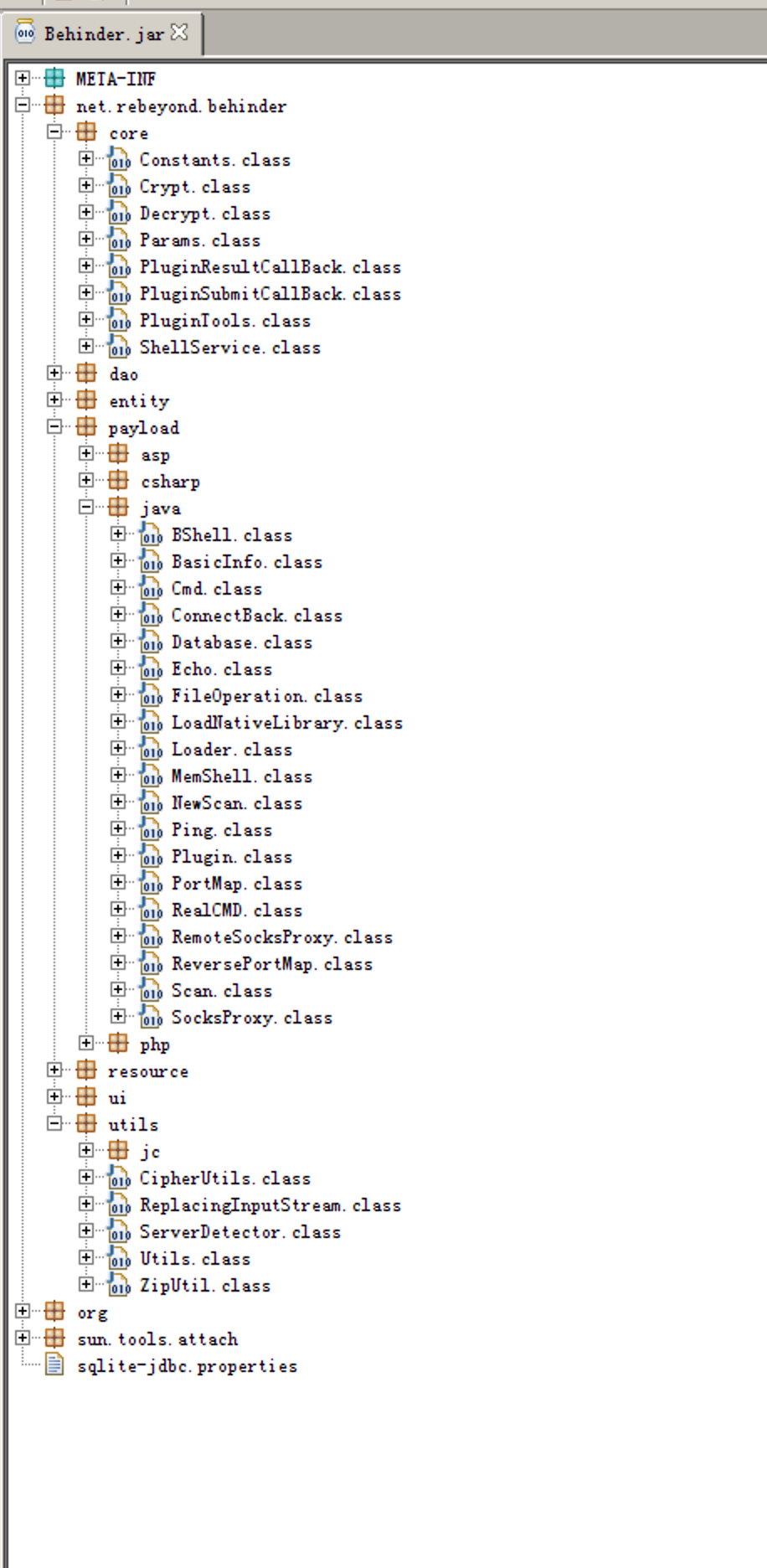 利用jd-gui简单看下冰蝎的源码,其中net.rebeyond.behinder为其核心代码,其中core.ShellService.class为Webshell的操作类,负责调用其他类实现加解密、获取服务端基本信息、命令执行等;payload.java下class文件为Java服务端的具体实现,可以通过ASM框架可以修改其下class文件属性值生成可用payload字节数组;utils.Utils.class为通用操作的具体实现,如payload传输、接收返回结果并解析等。