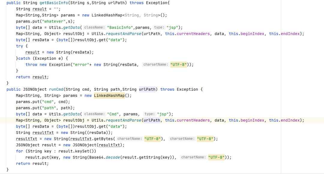 ShellService.class中getBasicInfo方法,调用Utils.getData方法获取payload.java下对应BasicInfo.class的字节数组;调用Utils.requestAndParse()发送payload并解析返回值。