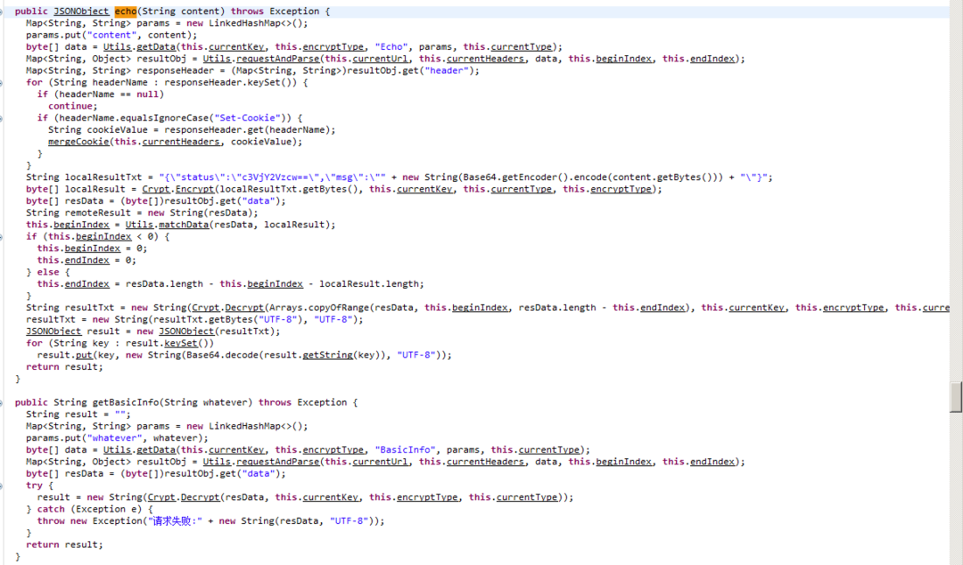 其中echo方法的实现原理与getBasicInfo实现原理相同:通过ASM机制动态编译payload/java/Echo.java获取字节数组发送给服务端.