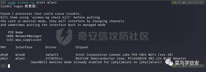 ifconfig at0查看at0网卡,如果没有ip地址或者不存在,重试以上步骤,注意!必须先使用airbase-ng创建AP点,at0网卡才会被可用!