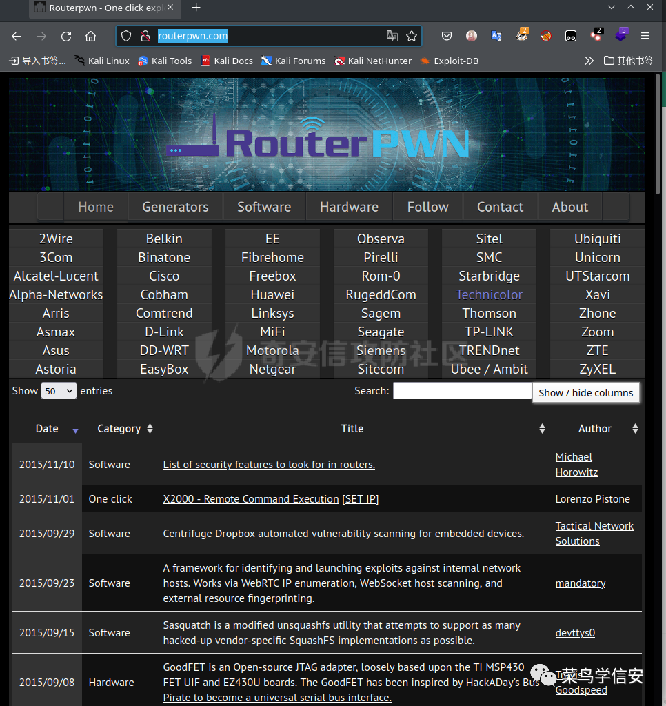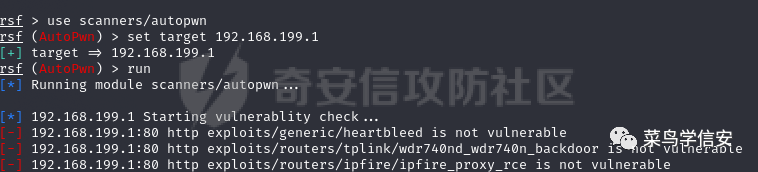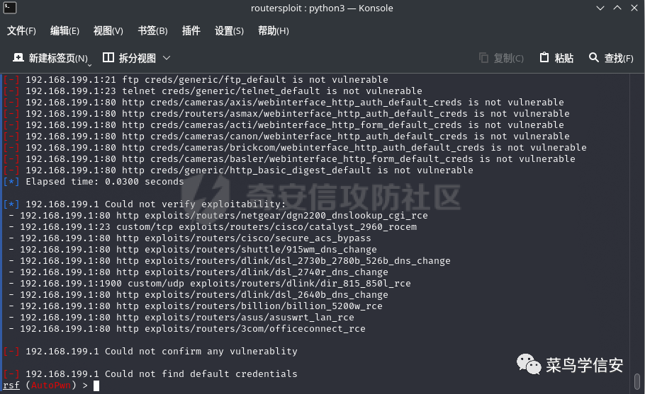 耐心等待扫描结束,如果该漏洞对路由器有效的话,会直接列出来,如果可能对该路由器有用会列出可能有效的漏洞当routersploit无法胜任时,还有一个汇总各大路由器漏洞的网站:http://routerpwn.com/