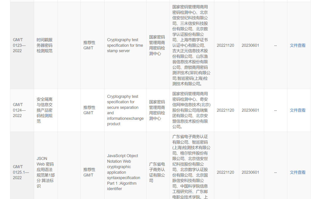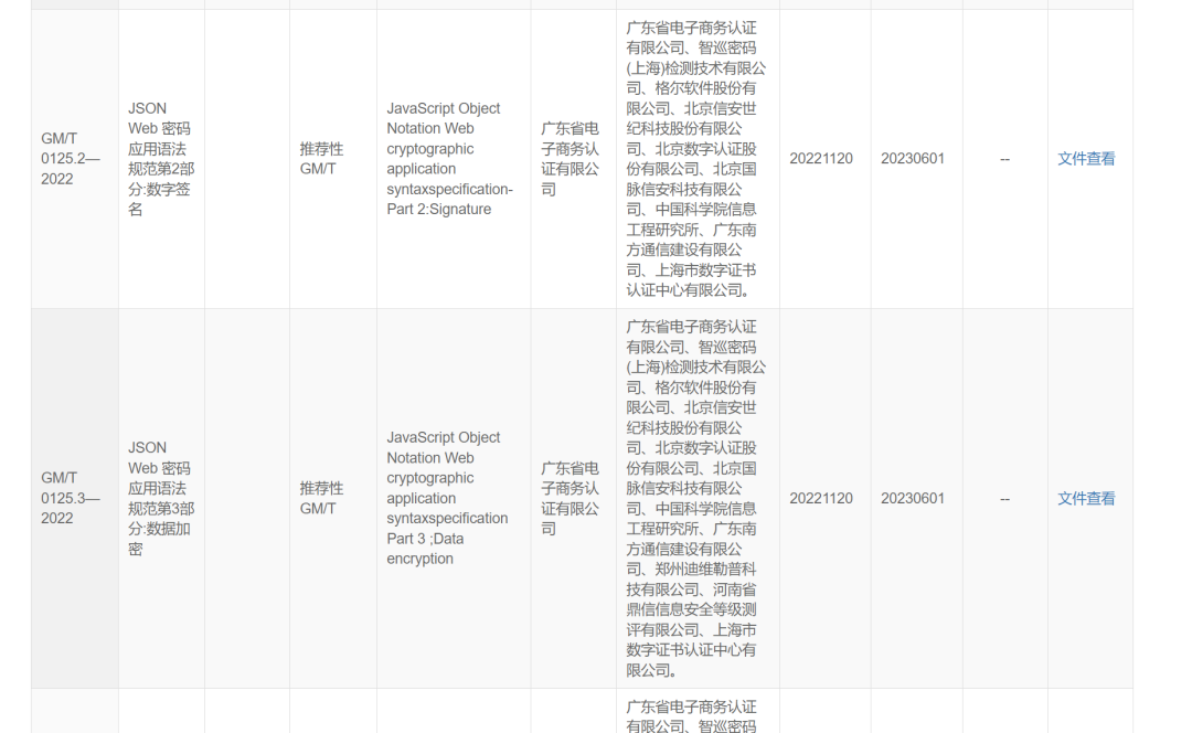 Mode LastWriteTime Length Name---- ------------- ------ -----a---- 2023/6/21 0:23 2076449 GM-T 0115—2021 信息系统密码应用测评要求.pdf-a---- 2023/6/21 0:25 1541834 GM-T 0116—2021 信息系统密码应用测评过程指南.pdf-a---- 2023/6/21 0:27 1735077 GM-T 0117—2022 网络身份服务密码应用技术要求.pdf-a---- 2023/6/21 0:28 1625282 GM-T 0118—2022 浏览器数字证书应用接口规范.pdf-a---- 2023/6/21 0:30 4487010 GM-T 0119—2022 PLC控制系统及PLC控制器密码应用技术规范.pdf-a---- 2023/6/21 0:31 3411538 GM-T 0120—2022 基于云计算的电子签名服务技术实施指南.pdf-a---- 2023/6/21 0:33 780510 GM-T 0121—2022 密码卡检测规范.pdf-a---- 2023/6/21 0:34 916299 GM-T 0122—2022 区块链密码检测规范.pdf-a---- 2023/6/21 0:35 640223 GM-T 0123—2022 时间戳服务器密码检测规范.pdf-a---- 2023/6/21 0:36 673939 GM-T 0124—2022 安全隔离与信息交换产品密码检测规范.pdf-a---- 2023/6/21 0:38 250024 GM-T 0125.1—2022 JSON Web 密码应用语法规范第1部分算法标识.pdf-a---- 2023/6/21 0:39 937007 GM-T 0125.2—2022 JSON Web 密码应用语法规范第2部分数字签名.pdf-a---- 2023/6/21 0:40 1332458 GM-T 0125.3—2022 JSON Web 密码应用语法规范第3部分数据加密.pdf-a---- 2023/6/21 0:42 559095 GM-T 0125.4—2022 JSON Web 密码应用语法规范第4部分密钥.pdf