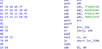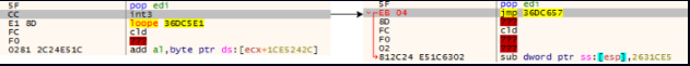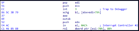 乍一看,这段代码中发生了什么并不清楚。然而,如果我们计算寄存器EDI中的值,则得到值0x100。接下来的几个指令的组合旨在推动EFLAGS并将TF (陷阱标志)位设置为“1”。然后,将堆栈中修改后的值设置回EFLAGS寄存器。