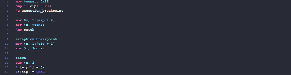 为了抛出异常,代码使用int3指令。可以实现一个脚本,将int3指令自动替换为跳转到正确地址的指令: