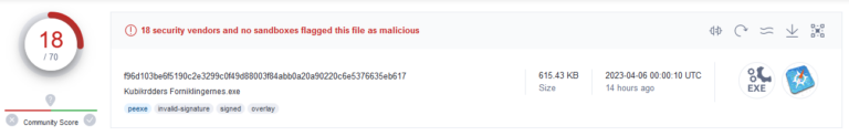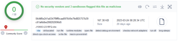 让我们考虑一个SHA256 5fcfdf0e241a0347f9ff9caa897649e7fe8f25757b39c61afddbe288202696d5的示例。在2023年3月3日上传到VirusTotal (VT)时,它从未被检测到: