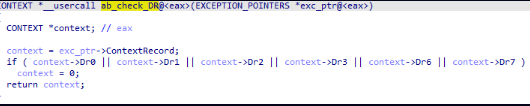 如果设置了任何硬件断点,异常处理程序将引用零地址而不是ContextRecord地址。这最终会导致应用程序崩溃。