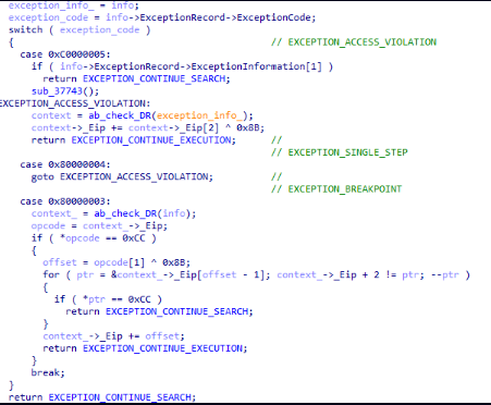 如上所述,根据异常代码的不同,VEH操作略有不同。在异常0x80000004 (EXCEPTION_SIGNLE_STEP)和0xC0000005 (EXCEPTION_ACCESS_VIOLATION)的情况下,它从发生异常的指令中获取偏移量2处的字节值,并将该字节与某个常数值进行XOR(本例中为0x8B)。在异常0x80000003 (EXCEPTION_BREAKPOINT)的情况下,将获取偏移量1处的字节,并使用常量进行XOR运算。需要注意的是,指定的常数在所有样品中都是不同的。然后将得到的值添加到异常上下文中的EIP值中。因此,当退出异常处理程序时,控制权将转移到新地址。