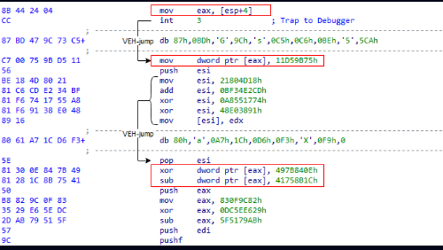 与代码的其他部分一样,VEH代码也被混淆了。它包含垃圾指令,并且使用XOR运算动态计算重要值: