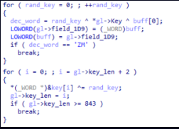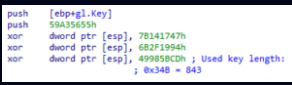 例如,在MD5 40b9ca22013d02303d49d8f922ac2739的示例中,密钥的长度为844字节。然而,另一个长度用于解密例程,并以混淆形式存储: