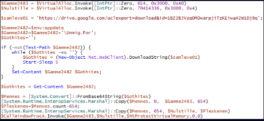 现在我们可以看到,脚本分配了2个内存区域,将数据从链接下载到Google Drive,并将其保存到临时文件“%APPDATA%\Umig.For”中。接下来,使用BASE64对下载文件的内容进行解码。解码数据的前654个字节被释放在第一个存储区域(本例中为“$Gamme2483”),其余的被释放在第二个存储区域中(本例为“$Nulstille”)。前654个字节包含一个混淆的shellcode,它旨在解密第二个复制区域,其中包含加密形式的shellcode的主要部分。