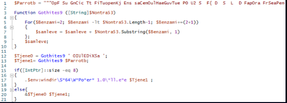 我们看到这个新脚本包含函数“Gothites9”,它实现了从第二个字符开始以3的步长剪切传递的字符串。因此,命令“$Tjene0=Gothites9'OIUlEDiXSa';”的结果是“IEX”。