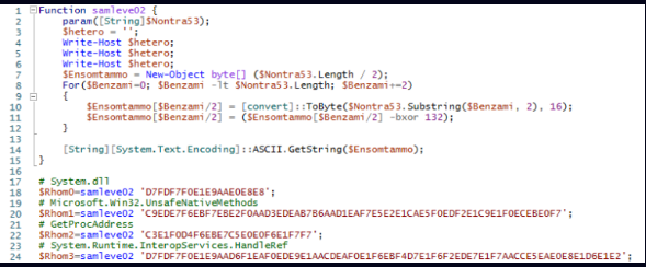 该脚本可以通过使用IEX命令(如果操作系统是32位)调用,也可以作为参数传递给从SysWOW64文件夹调用的PowerShell解释器(如果操作系统是64位)。这是因为GuLoader shellcode必须在32位进程中运行。