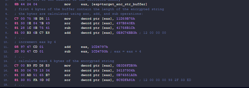 所有字符串,包括下载最终有效负载的URL,都被加密并以特定形式存储在shellcode中: