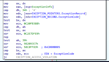 导致访问违规异常(0xC0000005)。该异常在GuLoader中由注册的VEH处理,该VEH计算新地址以继续执行shellcode。所使用的数字和导致计算零值的数学运算总是不同的。
