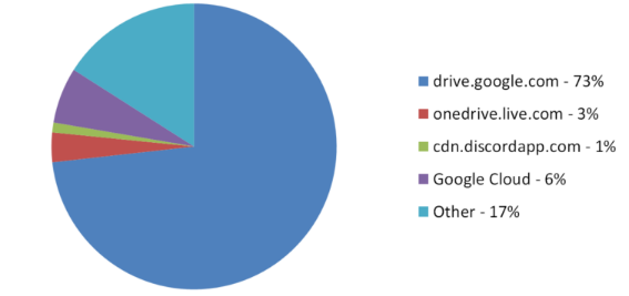 尽管谷歌努力阻止GuLoader加密的恶意负载,但在大多数情况下,GuLoader仍然从谷歌硬盘下载负载。下图显示了GuLoader在过去一个月使用的不同托管服务的统计数据。