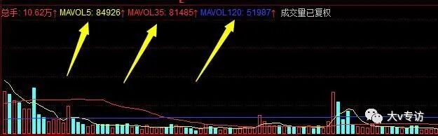 (2)某一个时间成交量开始放大,成交量柱突破并高于5、35、120三条交织的均量线,并导致原本平行运行的三条线发生明显变化: