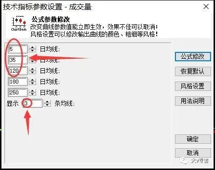 在均量线的参数设置当中,我们把前面三条均量线的周期修改为5、35、120,下面显示数量设置为3即可。这样在K线下方的量柱上,就可以叠加显示三条均量线了。